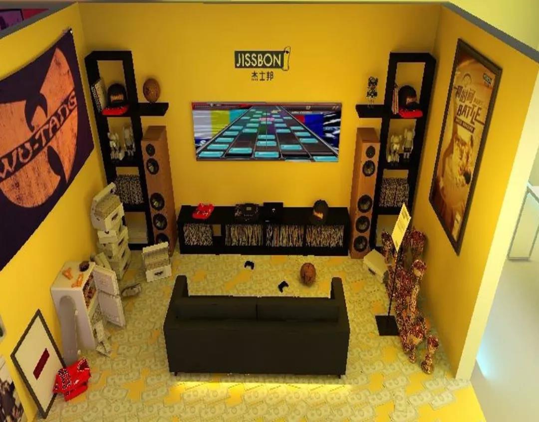 以亚洲胜游VI色中的黄色来呈现四张街头风格的套套小黄人是大家最青睐的合照对象悬挂的黄色气球街头画报风的海报张贴明黄、明亮、鲜艳。